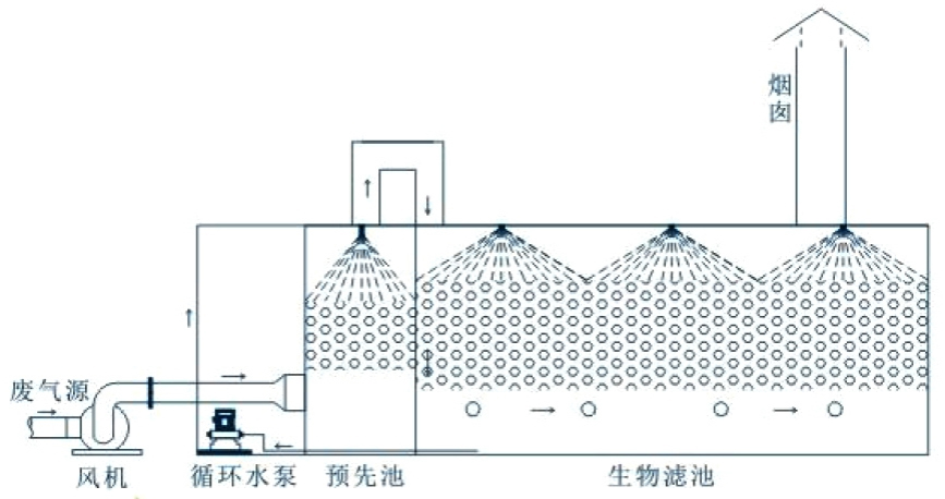 具體過程是:先將人工篩選的特種微生物菌群固定于填料上,當(dāng)污染氣體經(jīng)過填料表面時,微生物菌群從中獲得營養(yǎng)源,在適宜的溫度、濕度、pH值等條件下,能夠快速生長、繁殖,并在填料表面形成生物膜。在臭氣通過期間,有機(jī)物被生物膜表面的水層吸收后被微生物吸附和降解,得到凈化再生的水被重復(fù)使用。